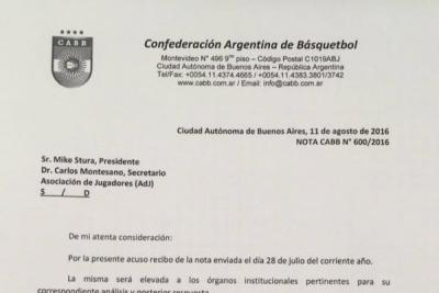 Los convulsionados días que vive la Liga Nacional y el TNA con el paro de jugadores que no quieren empezar la pretemporada tuvo otro capítulo hoy cuando la Confederación Argentina hizo acuse de recibo de la carta que le envió la AdJ mencionando que “la misma será enviada a los órganos institucionales pertinentes para su correspondiente análisis y posterior respuesta”.